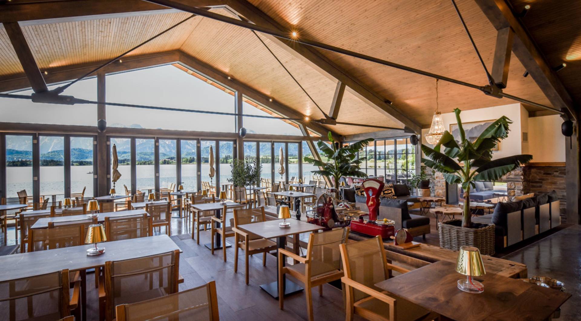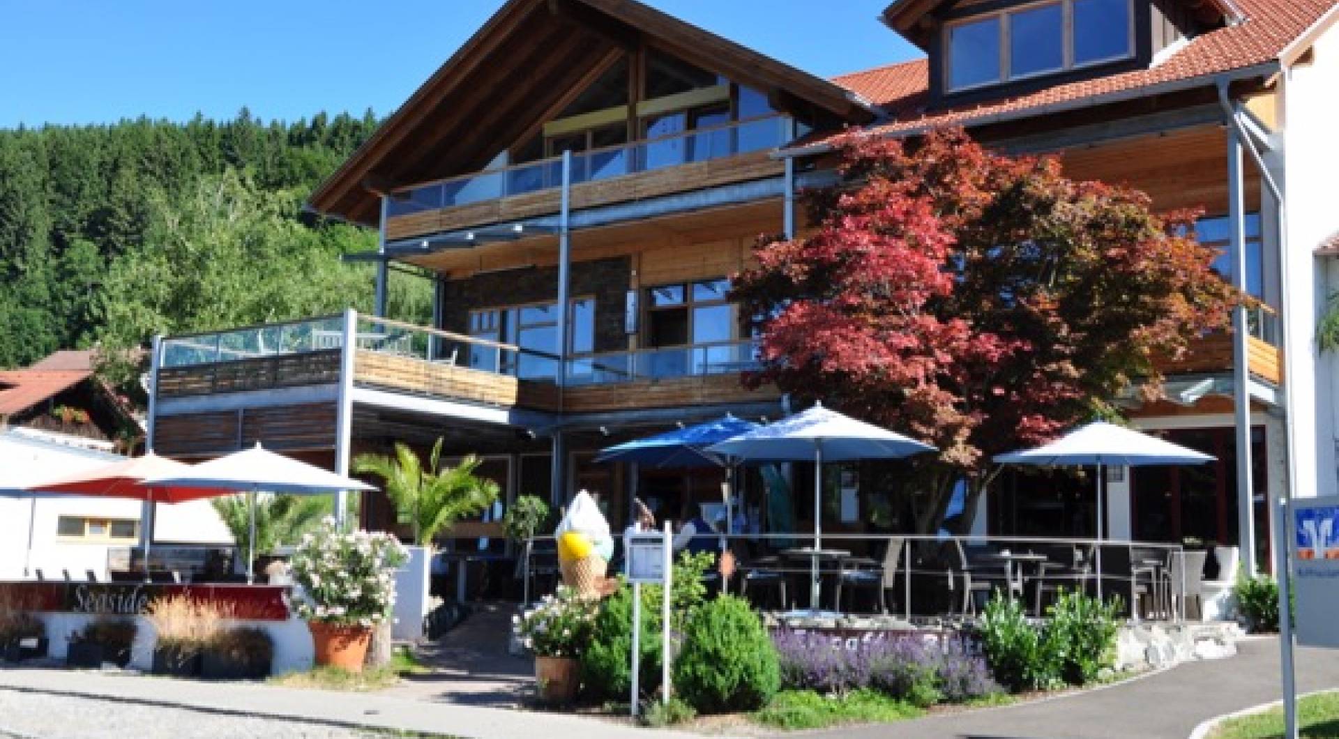 Auf unserer stilvollen Sonnenterrasse erleben Sie einen unvergesslichen Ausblick auf den Hopfensee, die Allgäuer Alpen, bis hin zu Schloss Neuschwanstein. Auch das Restaurant bietet mit seiner großflächigen Verglasung unverbauten Blick über den See auf die Berge.